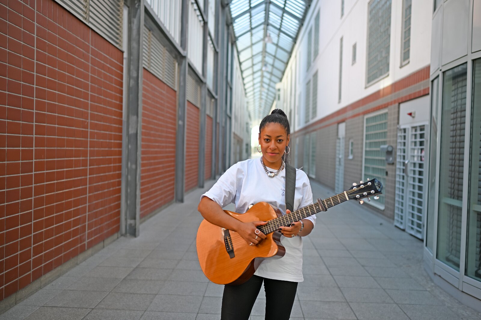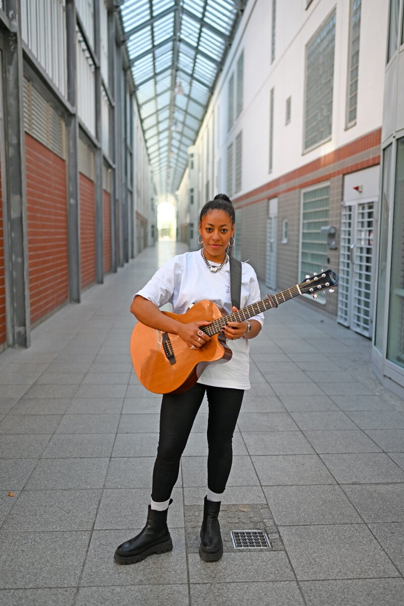 Diana Ezerex tritt in der JVA Weiterstadt am 21. August 2024 vor rund 70 Insassen auf. Bild: Künstlerin im Gang zu den Zellentrakten. 21082024…