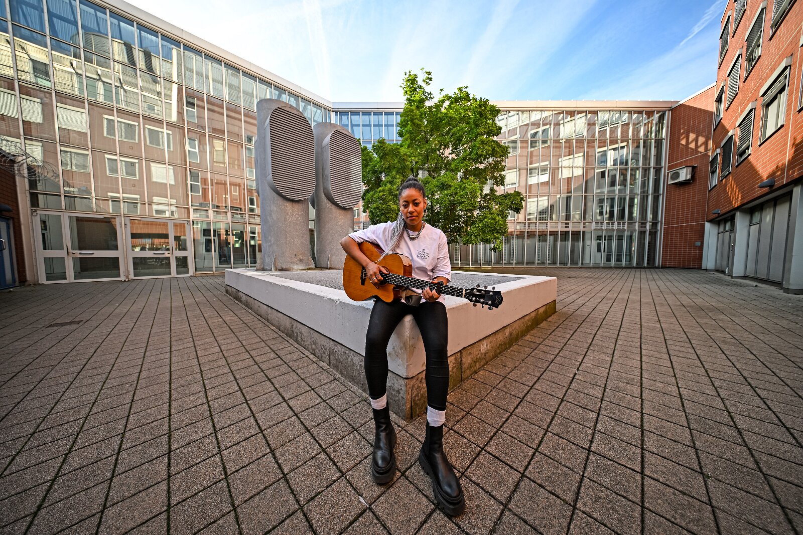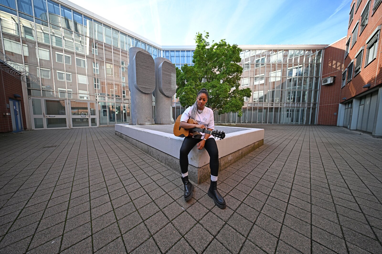 Diana Ezerex tritt in der JVA Weiterstadt am 21. August 2024 vor rund 70 Insassen auf. Bild: Innenhof der JVA. 21082024 Justizvollzugsanstalt Weiterstadt…
