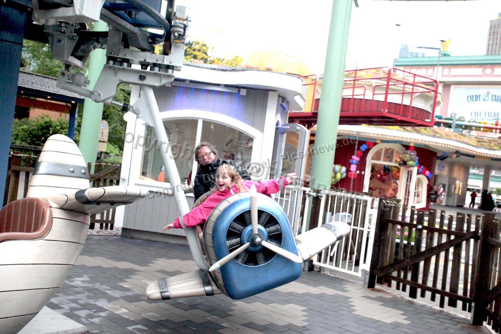Bild: mit ausgestreckten Armen fliegt das kleine Mädchen im Flugzeug in diesem Fahrgeschäft